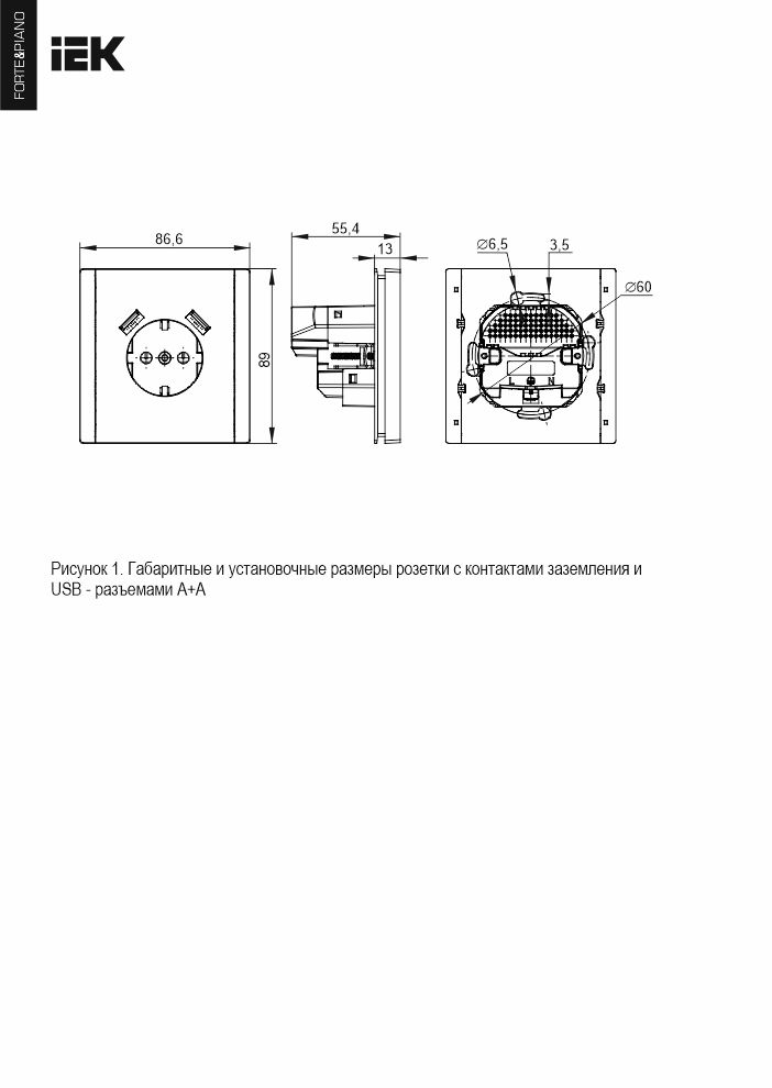 FORTE&PIANO Розетка 1-местная с заземлением с защитными шторками винтовое крепление 16А USB A+A 3,1А FP145 черный IEK