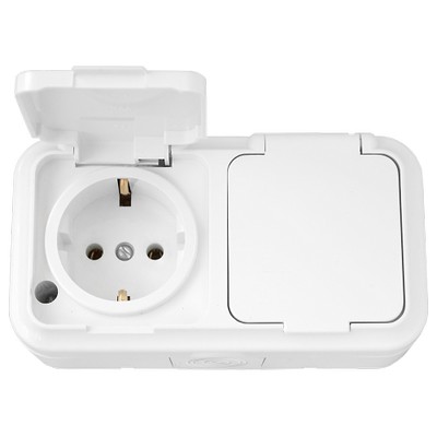 Розетка 2-местная с заземляющим контактом брызгозгозащищенная открытой установки, РА16-213