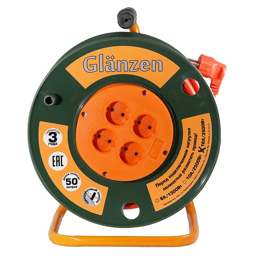 Удлинитель силовой на катушке GLANZEN с 4 гнездами и кабелем ПВС 2×2,5 мм², длиной 50 м — надёжное решение для подключения бытового и промышленного электрооборудования. Максимальная нагрузка до 16 А обеспечивает безопасное подключение устройств суммарной мощностью до 3,7 кВт.