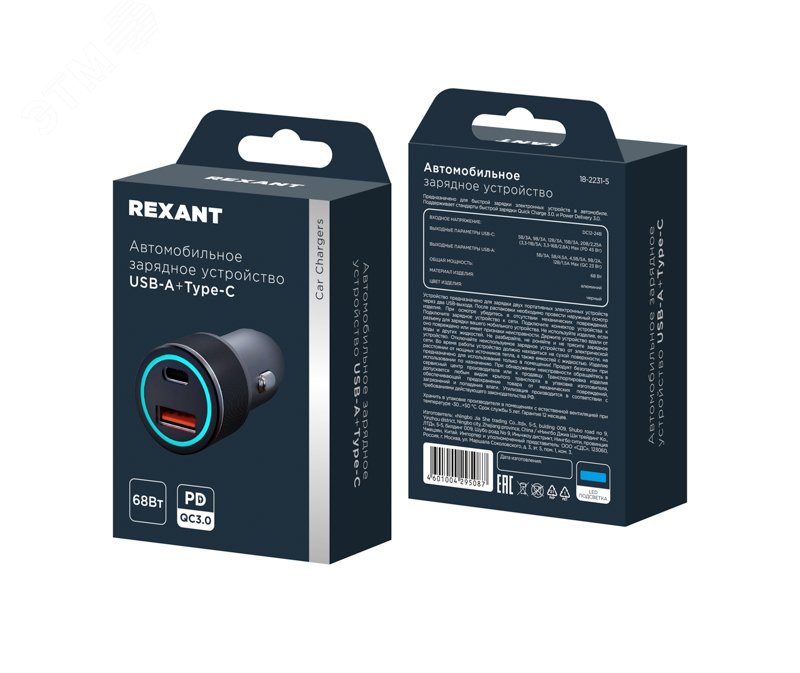 Автомобильное зарядное устройство c 2 портами (USB-C+USB-A) c LED-подсветкой, 68Вт REXANT, 18-2231-5