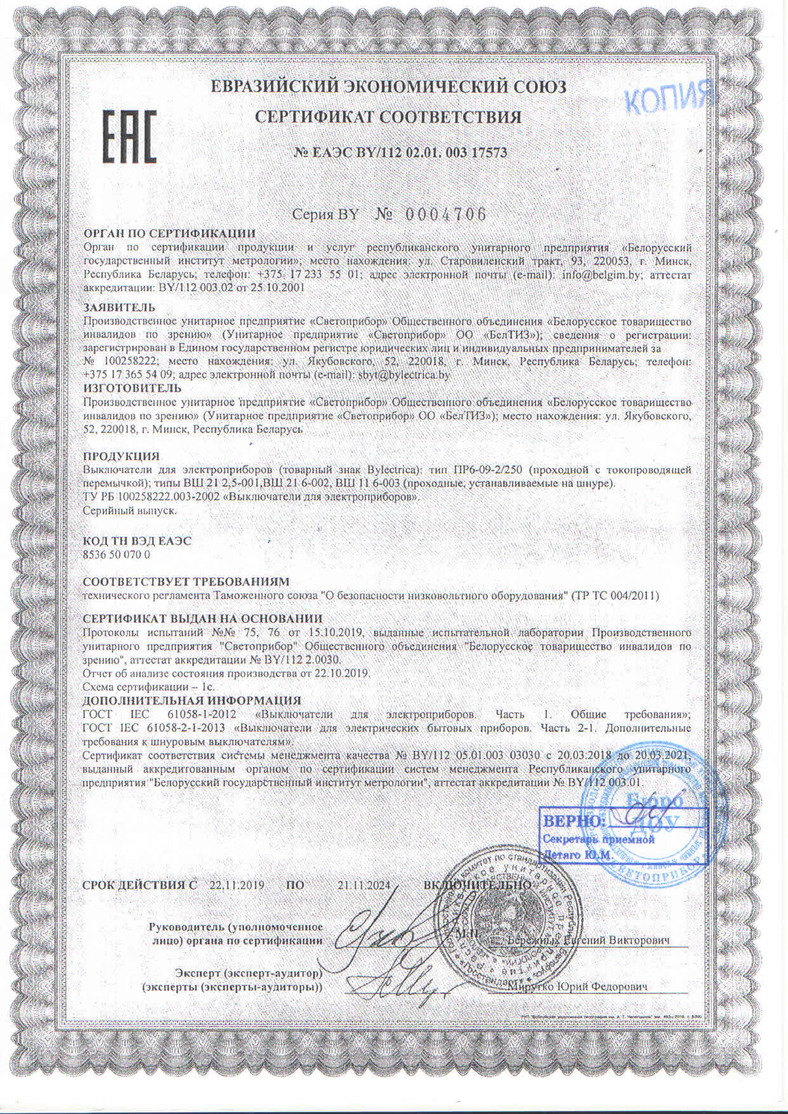 Выключатель на шнур ползунковый, ПР6-09-2/250