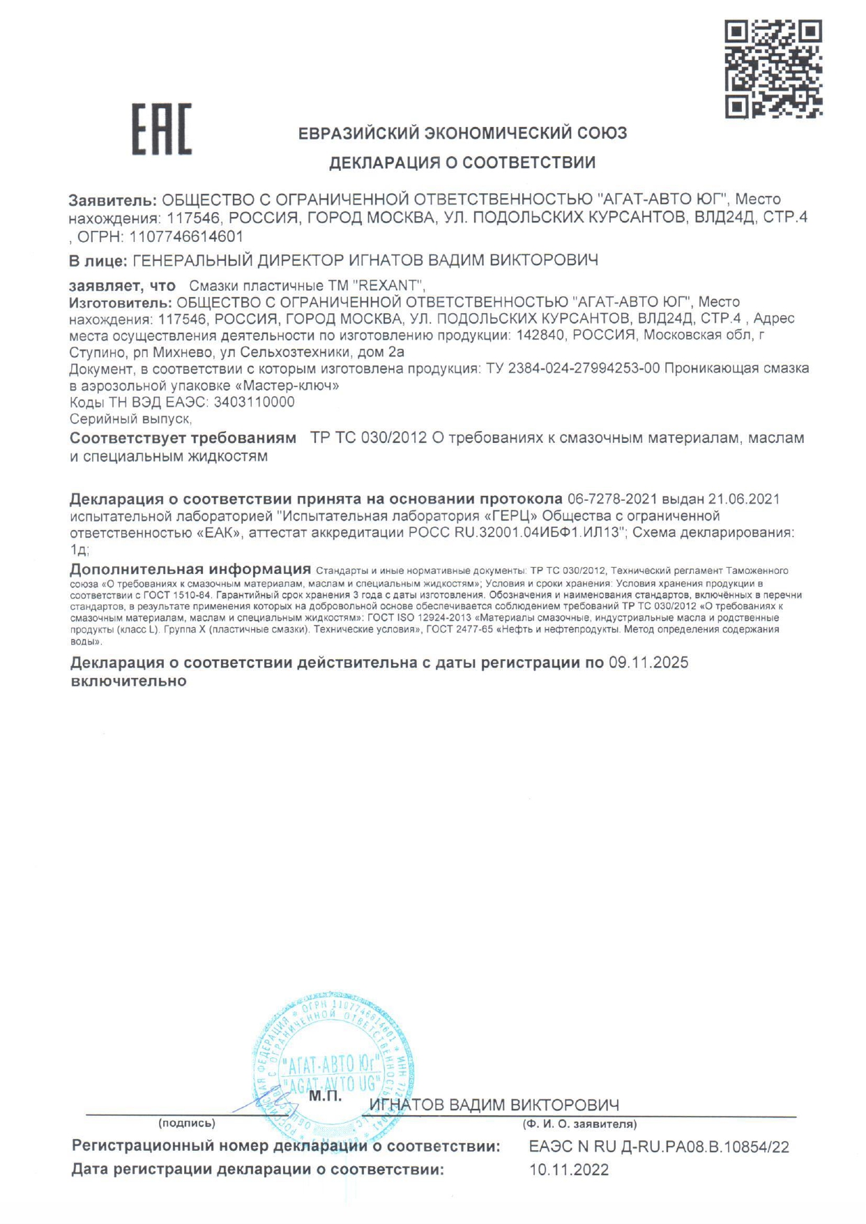 Состав: алифатические растворители >30 %, минеральное масло 15-30 %, загуститель, ингибитор коррозии, ультрадисперсный порошок PTFE <5%, углеводородный пропеллент >30 %.