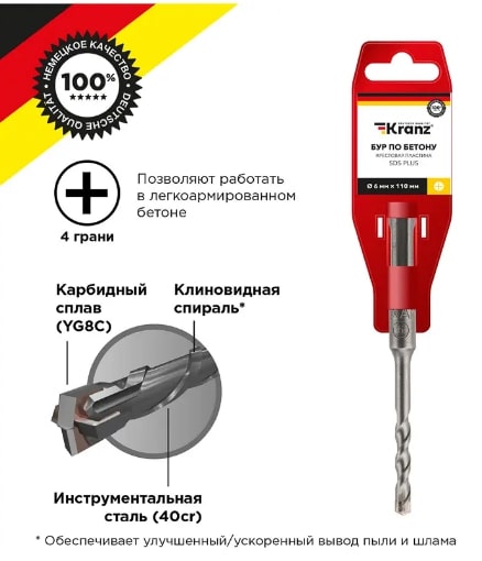 Купите товары, такие как Бур по бетону 6x110x50мм, крестовая пластина, SDS PLUS KRANZ, в интернет-магазине 220volt, предварительно уточнив их наличие. Вы можете получить товар удобным для вас способом: доставка или самовывоз.
