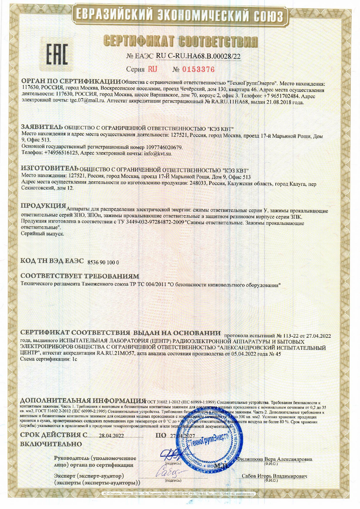 Продукция КВТ соответствует международным стандартам IEC и требованиям ТР ТС для электротехнического оборудования