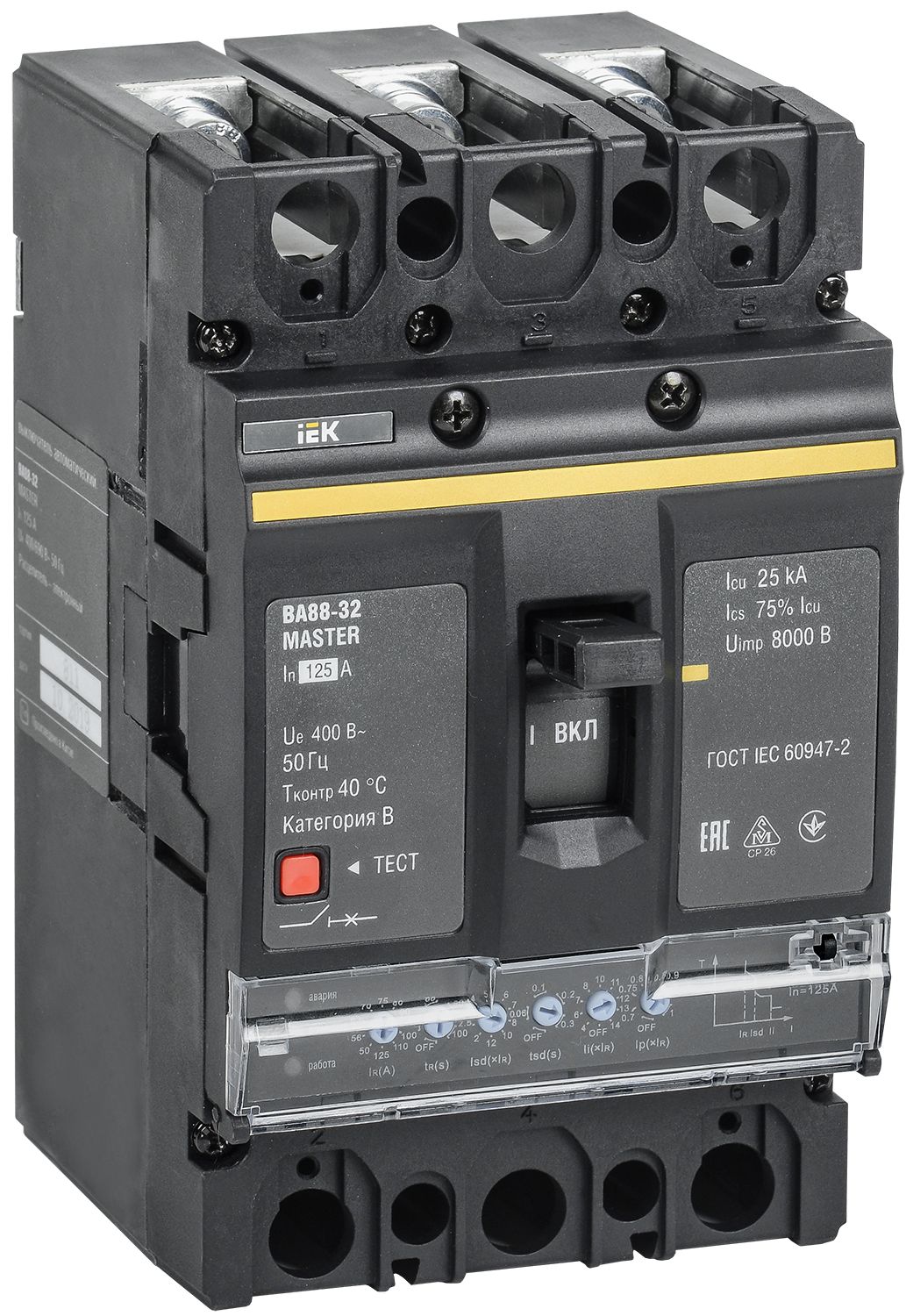 Выключатель автоматический ВА88-32 3Р 125А 35кА MASTER с электронным расцепителем ИЭК — силовой автомат в литом корпусе с электронным расцепителем, предназначенный для защиты электрических сетей от перегрузок, коротких замыканий и иных аварийных режимов. Применяется в распределительных щитах и вводно-распределительных устройствах промышленных, коммерческих и инфраструктурных объектов с повышенными требованиями к точности защиты.