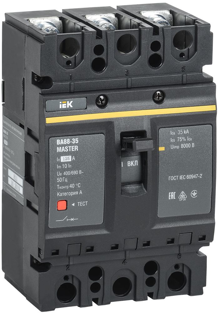 Выключатель автоматический ВА88-35 3Р 125А 35кА MASTER IEK — силовой автомат в литом корпусе, предназначенный для защиты электрических цепей от перегрузок и коротких замыканий. Применяется в вводно-распределительных устройствах, главных распределительных щитах и силовых линиях промышленных, коммерческих и инфраструктурных объектов. Обеспечивает надежное отключение при аварийных режимах и высоких токах короткого замыкания.