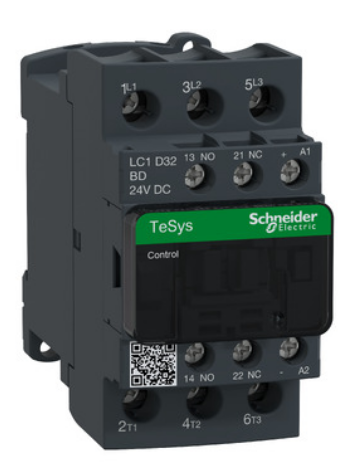 Контактор TeSys Deca LC1D32BD — это трёхполюсный силовой коммутационный аппарат (3NO), предназначенный для управления асинхронными электродвигателями и другими нагрузками в сетях переменного тока до 690 В. Устройство рассчитано на категорию применения AC-3 и обеспечивает надёжную коммутацию двигателей мощностью до 15 кВт при 400 В. Оснащён катушкой управления 24 В постоянного тока с модулем подавления переходных процессов и встроенными вспомогательными контактами 1НО+1НЗ (в том числе зеркальный НЗ, сертифицированный), что повышает функциональность и безопасность системы