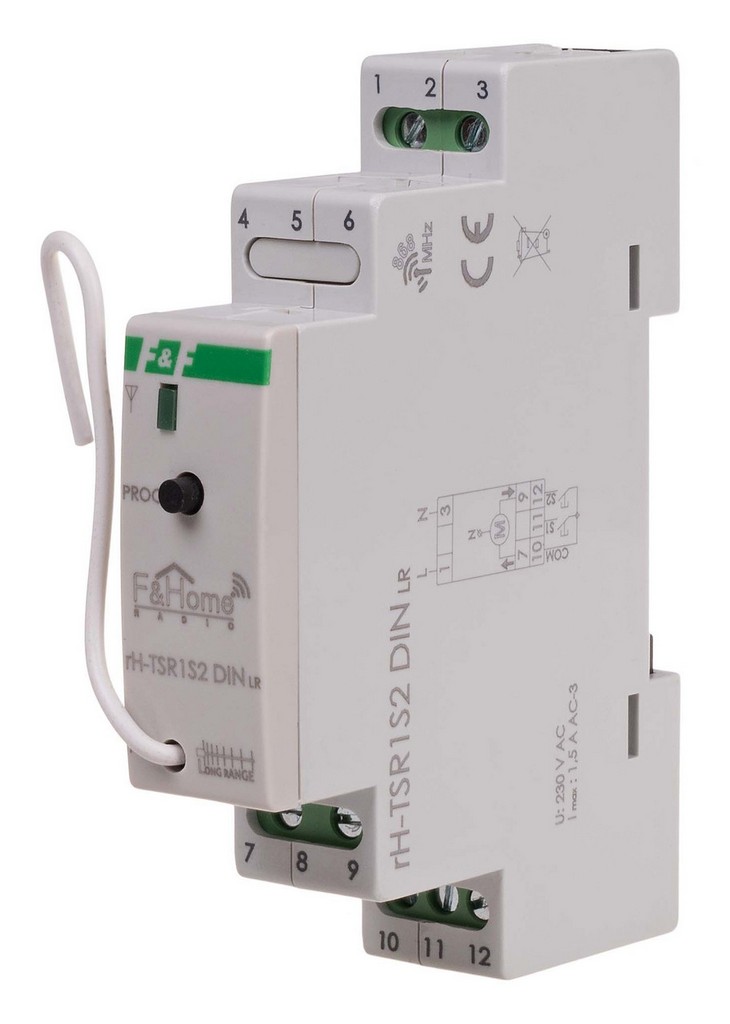 Реле управления роллетами rH-TSR1S2 DIN LR торговой марки F&Home RADIO, производитель F&F Filipowski sp. komandytowa, представляет собой исполнительный модуль для системы «Умный дом» F&Home Radio. Модуль предназначен для управления жалюзи, роллетами, экранами, воротами и другими устройствами с электроприводом небольшой мощности 230 В AC, где необходимо изменение направления вращения: вверх, вниз, стоп. Устройство имеет два входа для моностабильных выключателей и два выхода для подключения электропривода, устанавливается на DIN-рейку.