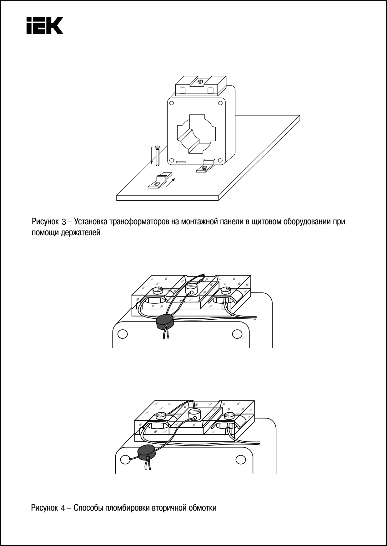 В комплект каждого трансформатора входит крышка, которой закрываются клеммы вторичной обмотки, крепежные элементы для установки на монтажную панель и фиксации шины, цветные наклейки для индикации фаз.