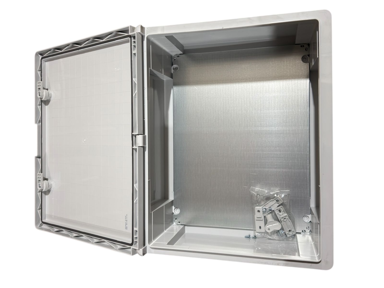 Корпус оснащён герметичной дверцей с надёжным замком, обеспечивающим безопасный доступ к оборудованию. Конструкция предусматривает удобный монтаж на стену и достаточное внутреннее пространство для аккуратной прокладки кабелей.