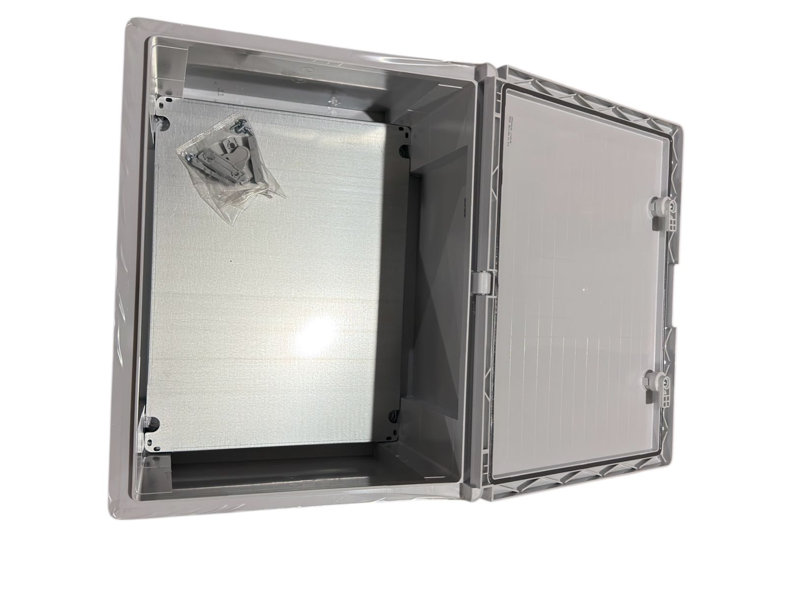 Корпус оснащён герметичной дверцей с надёжным замком, обеспечивающим безопасный доступ к оборудованию. Конструкция предусматривает удобный монтаж на стену и достаточное внутреннее пространство для аккуратной прокладки кабелей.