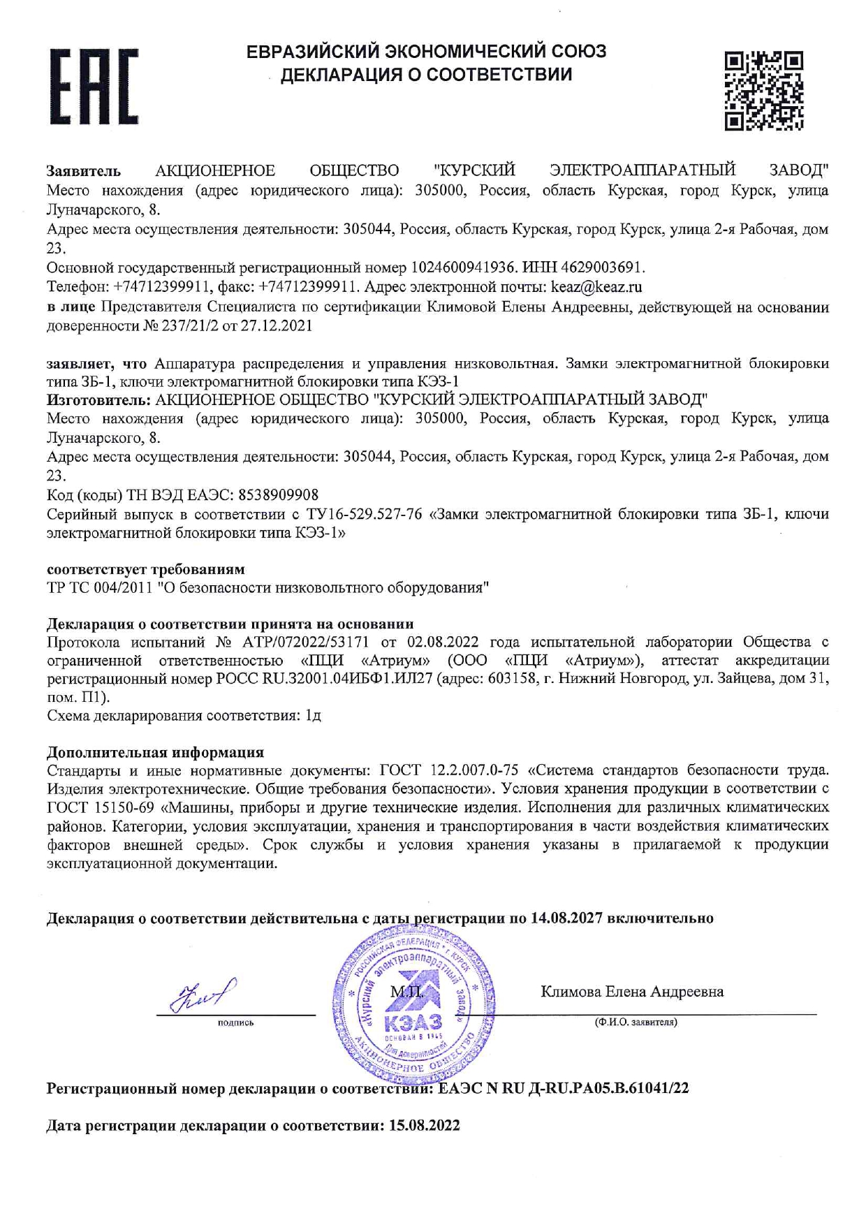 Замки электромагнитной блокировки типа ЗБ-1 и ключи электромагнитной блокировки типа КЭЗ-1 изготавливаются по ТУ16-529.527-76 и соответствуют ТР ТС 004/2011, ГОСТ 12.2.007.0. Климатическое исполнение замков и ключей УХЛ категории размещения 3 по ГОСТ 15150. Степень защиты замков и ключей IP00 по ГОСТ 14255.