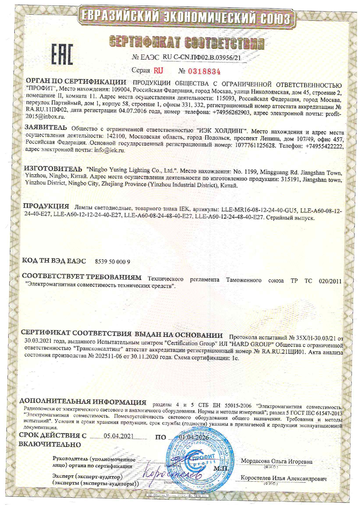 Соответствует требованиям Технических регламентов Таможенного союза ТР ТС 020/2011, ТР ТС 037/2016, МЭК 62560, Постановления Правительства РФ от 10.11.2017 № 1356.