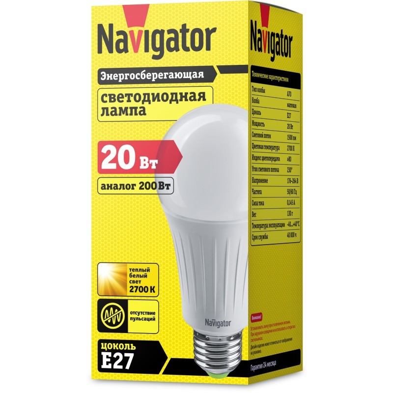 Купите товары, такие как Лампа NLL-A70-20-230-2,7K-E27 61 386 Navigator, в интернет-магазине 220volt, предварительно уточнив их наличие. Вы можете получить товар удобным для вас способом: доставка или самовывоз.