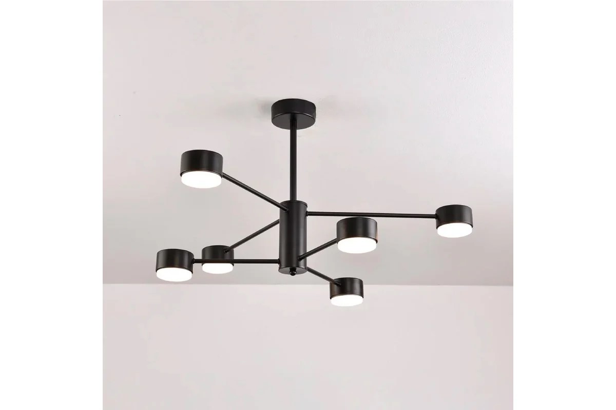 Люстра GUSTA 6xGX53 предназначена для установки 6 светодиодных ламп GX53 формы "таблетка". Она сочетает современный минималистичный дизайн с надежными материалами — корпус выполнен из металла (алюминиевый сплав) с матовым черным покрытием, а световой "экран" формирует сама лампа. Конструкция открытая, лампы устанавливаются вровень с краем декоративных цилиндров.