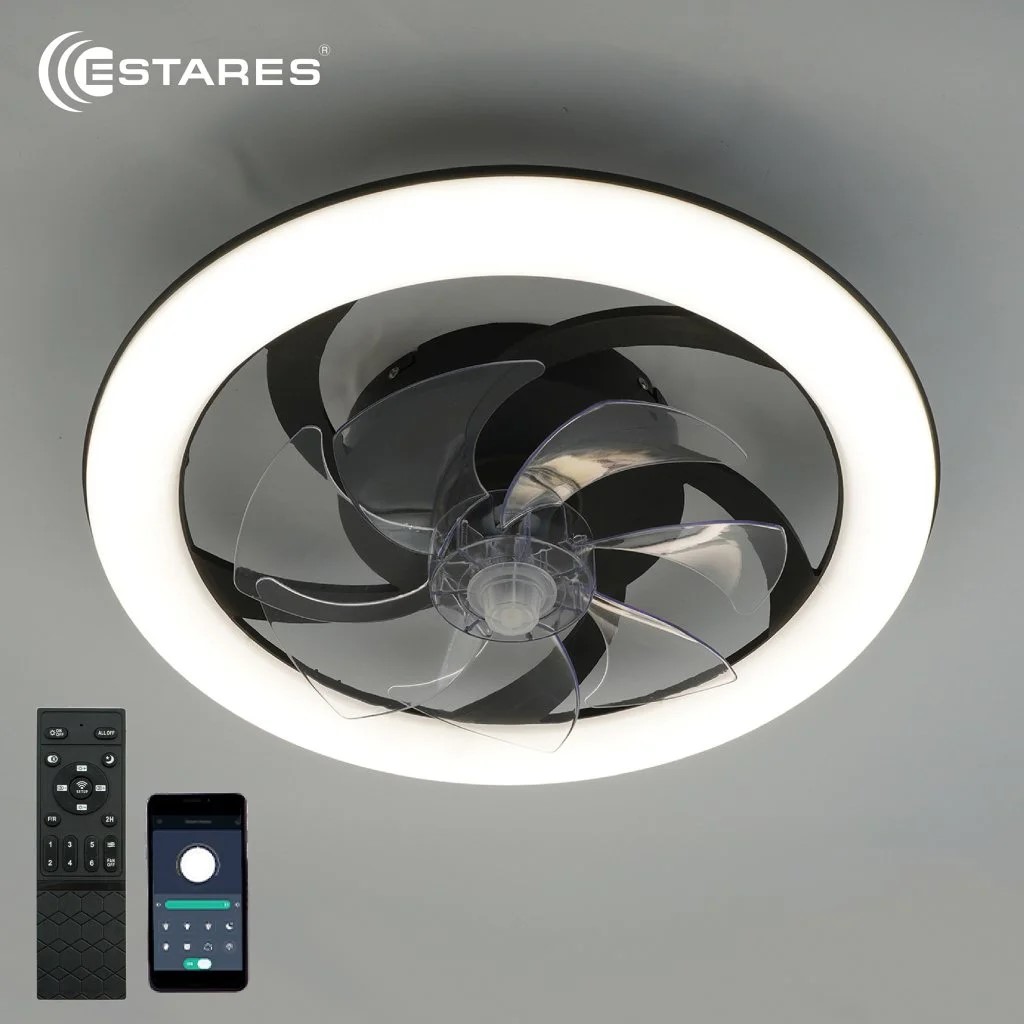 Люстра управляемая Estares FAN SIMPLE сочетает светодиодное освещение с тихим вентилятором, обеспечивая комфортное освещение и вентиляцию в жилых и коммерческих помещениях. Управление светом и скоростью вентилятора осуществляется через мобильное приложение (APP) или пульт. Модель поддерживает несколько скоростей вентилятора (3–6) и плавную регулировку яркости и цветовой температуры света.