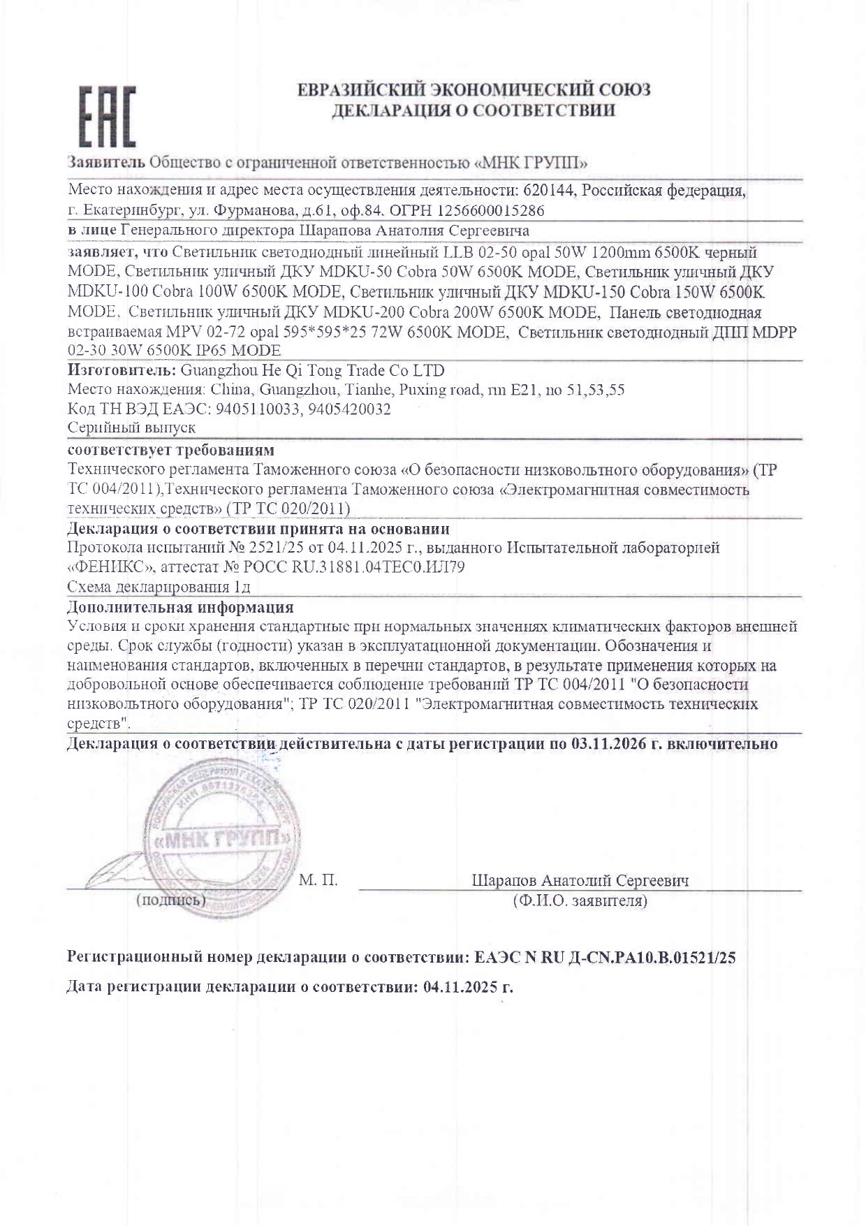 Светильник оснащён опаловым рассеивателем, который обеспечивает равномерное распределение светового потока без резких бликов и снижает нагрузку на глаза. Цветовая температура 6500K даёт яркий холодный белый свет, оптимальный для рабочих зон, торговых залов, складов, офисов и производственных помещений.