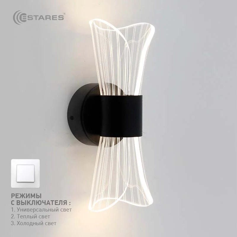 Бра светодиодное управляемое Estares DIO 12 Вт выполнено в современном стиле с прозрачными декоративными элементами, создающими эстетичные блики. Модель оснащена высококачественными LED-модулями, обеспечивающими равномерное освещение без мерцания и долговечную работу. Управление осуществляется с помощью обычного настенного выключателя: быстрое включение и выключение позволяет переключать цвет свечения между тёплым, нейтральным и холодным (функция ON/OFF). Яркость не регулируется. Корпус выполнен в черном цвете с прозрачными вставками и соответствует степени защиты IP20.